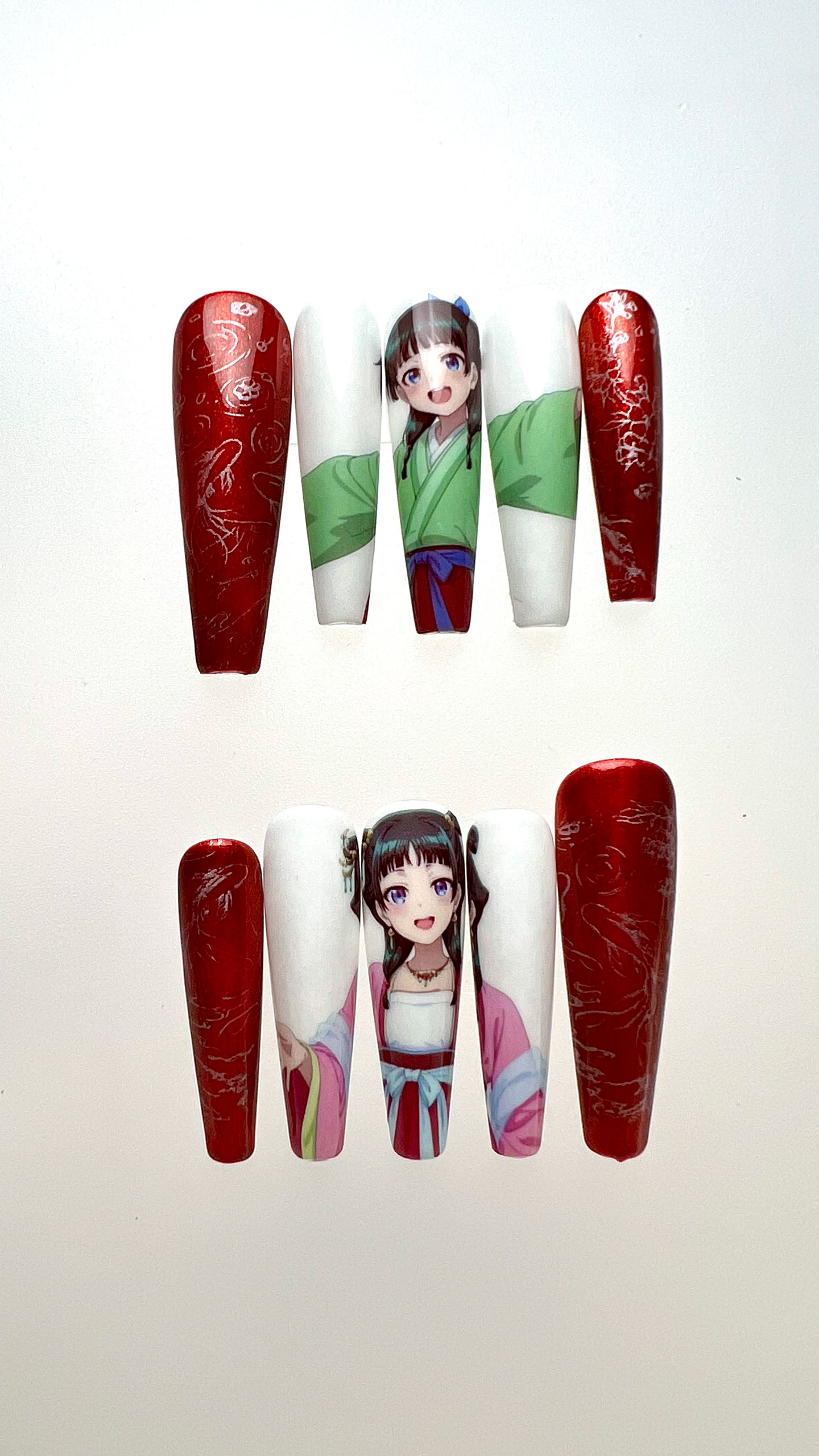 This nail set brings MaoMao to life with her cutest portraits in light green and pink hanfu. Crimson nails with palace goldfish add an epic, adorable twist. 🐟 Which costume are you rocking?
